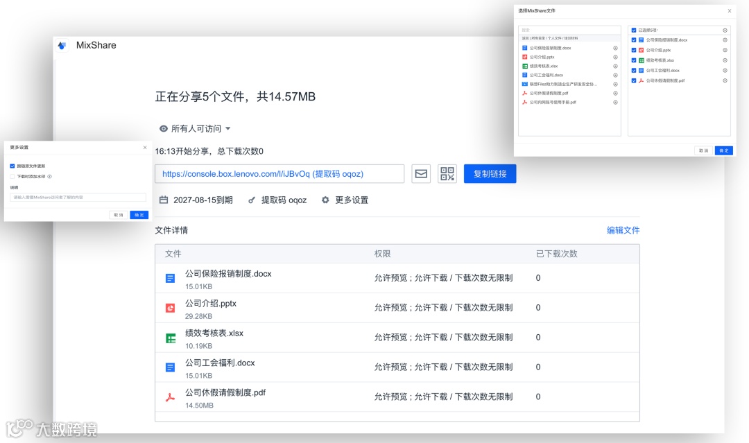 同时,还有一些历次培训积累的好教材,以及讲师分享的最新课件,这时候就需要组合这些散落在各种目录中的资料了,MixShare文件购物车就是集中共享这些资料的好工具,通过MixShare把分布在不同文件夹的文件材料聚合在一个链接里,可以提高人力资源的工作效率, MixShare可以设置下载时添加水印,防止文件被盗用。还可以设置提取码和链接有效时间,用手机扫描快速分享链接至微信、QQ等平台。