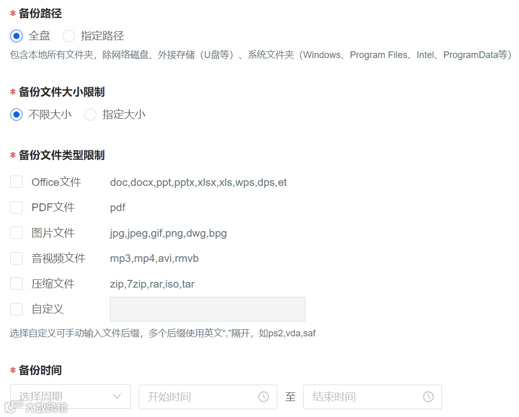 同样可以对文件备份的策略进行个性化的设置,指定备份的路径、文件大小和类型限制、备份时间的调整等。