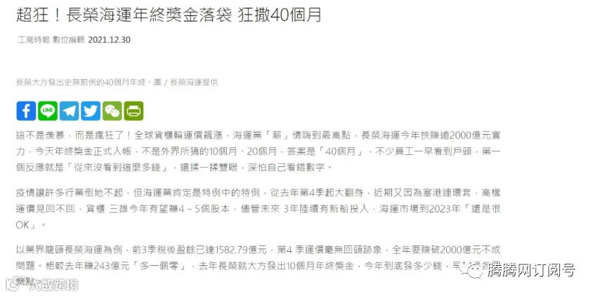 据台湾《工商时报》今日(2021年12月30日)报道,长荣海运向员工发放年终奖,奖金额度高达月薪的40倍。