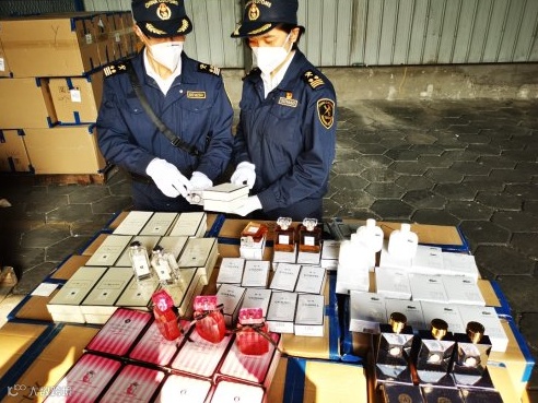 此前,广州海关所属佛山海关驻南海办事处查验关员在对一票申报出口至菲律宾的休闲鞋、包装袋、奶茶桶进行查验时,发现货柜内夹藏有未向海关申报的香水。这些香水的包装盒上印有“CHANEL”“Jo Malone”“LACOSTE”等标识,数量多达155箱共7440瓶,但发货人无法提供相关授权证明,关员初步判断存在侵权嫌疑,立即中止货物通关,并通知相关知识产权权利人进行确权。