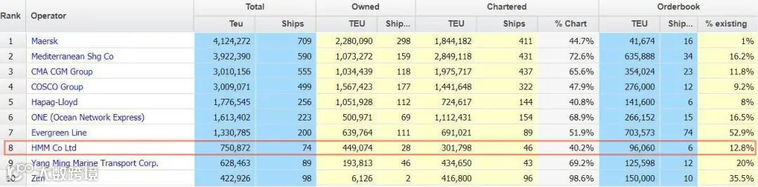 根据Alphaliner的最新统计,截至2021年4月19日,HMM的总运力为75万TEU,排名全球第8位。
