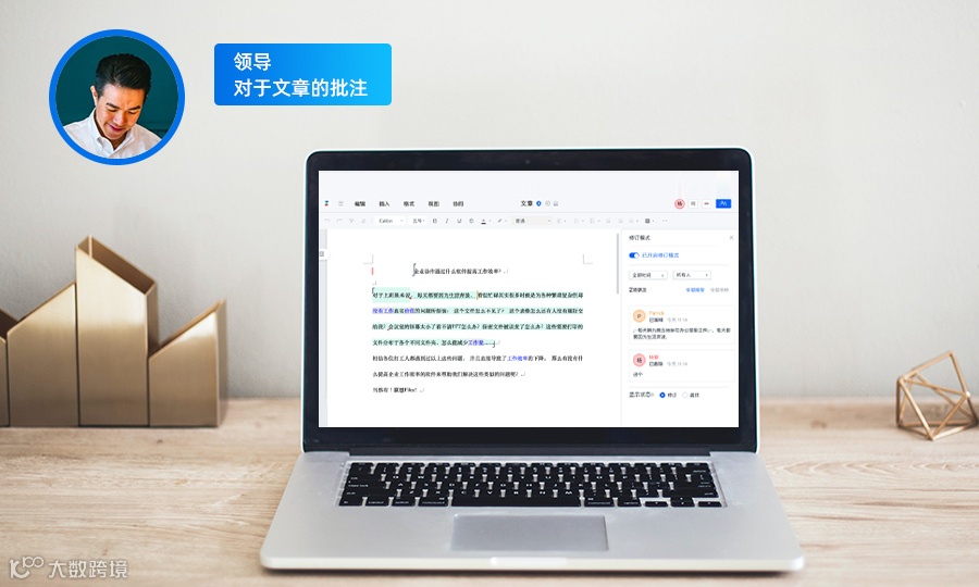 领导A通过zOffice在线编辑修改文章,开启修订模式可以实时批注迅速给出修改意见,批注的状态可以帮助用户筛选已经关闭的讨论,或者还未关闭的讨论。批注的筛选能力帮助用户快速定位到@提及当前用户的批注,或者搜索包含某些关键字的批注。