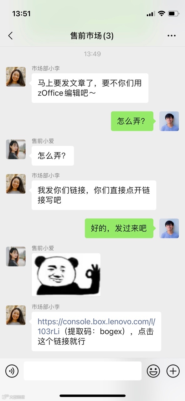 眼看着发文时间一天天临近,但是文章还没有着落,市场部小李想到了联想Filez可以用手机撰写,售前的同事就算在火车上同样也不需要打开电脑,于是就把zOffice的链接通过微信发送了他们,这样售前的两位同事可以各自写内容,不仅节省了时间,同时文章的完整性也能得到保障,并且市场部小李可以通过链接实时查看售前同事的进度。