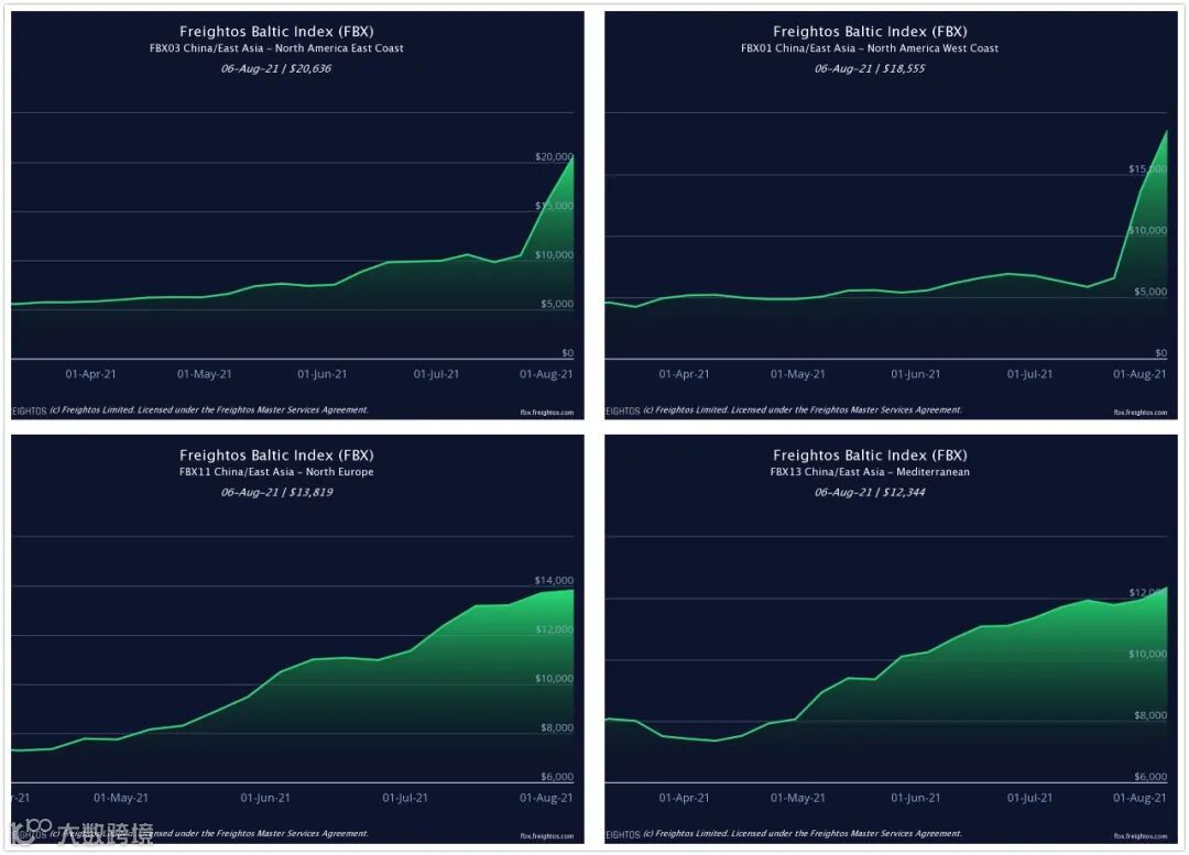 中国至美东的海运价格,首次超过了每标箱2万美元达到20636美元;