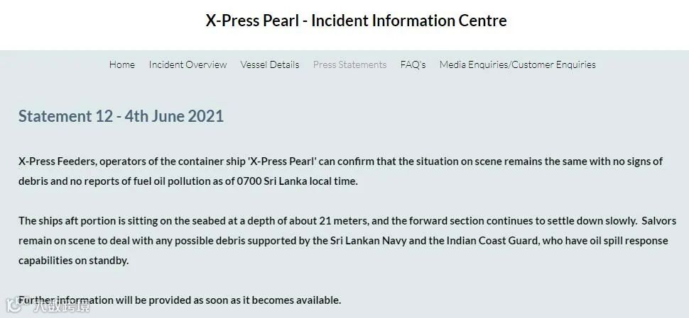 根据该轮船东X-Press Feeders发布的公告,6月2日,“X-Press Pearl”轮的船尾部分已经沉入海底,深度约21米,船头部分也在缓慢下沉。