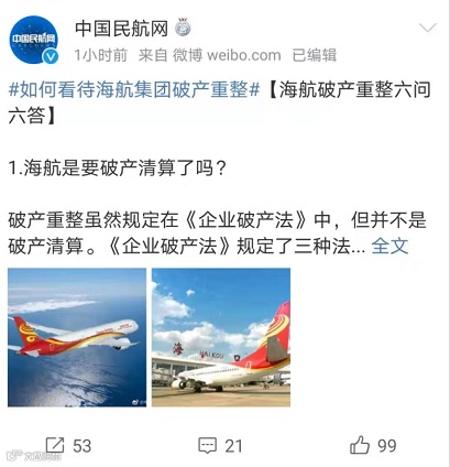 对于海航集团来说,进入破产重整程序主要是按照法治化、市场化原则解决债权、债务问题,并不会影响其航空主业正常生产运行,重整完成之后航空主业将实现“轻装上阵”,真正做到“聚焦主业、健康发展”。