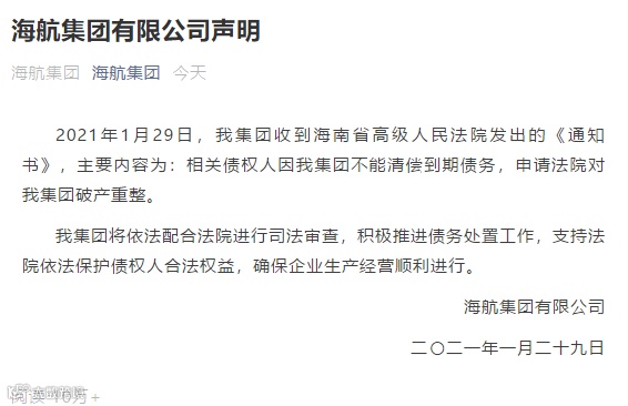 2021年1月29日,我集团收到海南省高级人民法院发出的《通知书》,主要内容为:相关债权人因我集团不能清偿到期债务,申请法院对我集团破产重整。