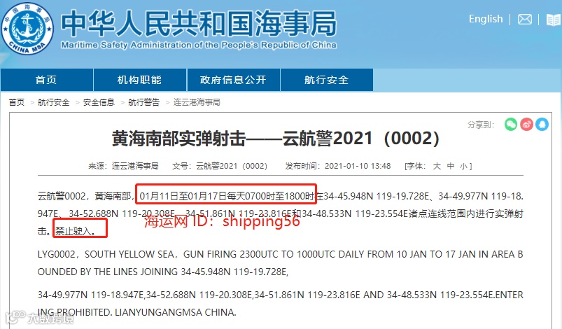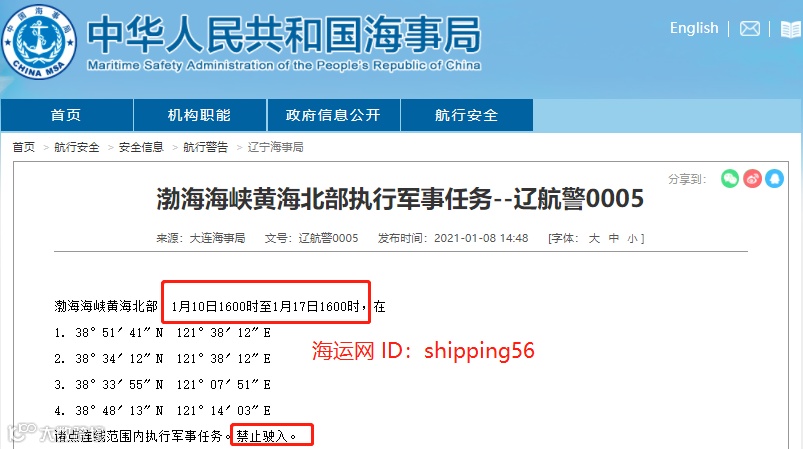 据大连海事局消息:渤海海峡黄海北部,1月10日1600时至1月17日1600时,在