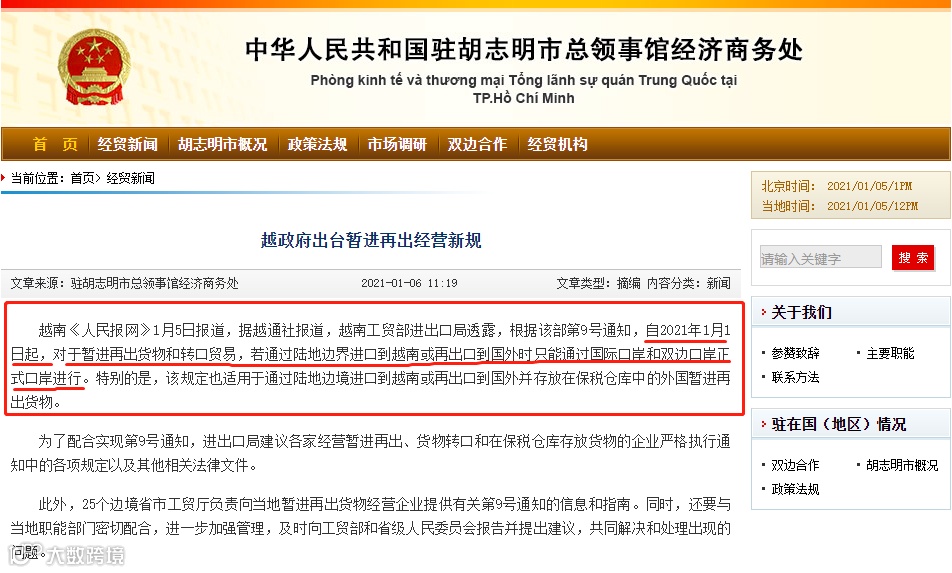 从2021年1月1日开始,越南工贸部颁发的09/2020/TT-BCT号通知开始生效,从第三国过境越南向邻国(其他国家)出口的暂进再出货物将不能通过边民互市点进行交易,而只能经过主要口岸进行交易。