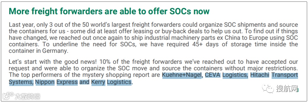 报告中提到能比较好提供SOC的货代有:Kuehne+Nagel, CEVA Logistics, Hitachi Transport Systems, Nippon Express,Kerry Logistics.