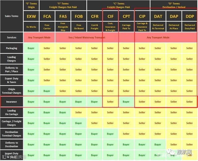 这张表格清晰地说明了,在哪些贸易术语下,该由卖方还是买方买保险。做FOB的出口商也可以提醒一下买家买保险,切莫贪小便宜吃大亏。