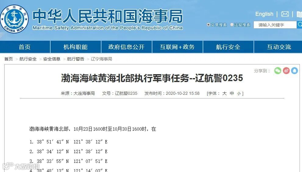 一、辽航警0235--渤海海峡黄海北部执行军事任务