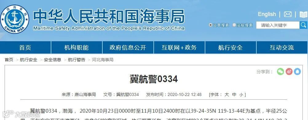 冀航警0334,渤海, 2020年10月23日0000时至11月10日2400时在以39-24-35N 119-13-44E为基点,半径25公里,正东方向至正南偏西6°、夹角96°的扇形区域,执行军事任务,该扇形区域的2个顶点坐标分别为39-24-14N 119-28-24E和39-13-13N 119-11-51E,禁止驶入。