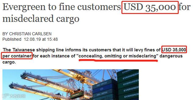 长荣海运将针对危险货物的瞒报、漏报和误报,收取每箱35000美元的罚金,约合人民币250000元。
