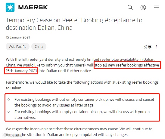 此前,马士基发布通知从2021年1月5日起根据PCD的预定对抵达大连的冷藏箱货物收取1000美元/每箱的“冷藏箱附加费”,1月15日,马士基发布公告:鉴于中国大连的冷藏货场利用率极高,冷藏箱插座的使用极为有限,现通知客户,从2021年1月15日起停止至大连所有冷藏箱的预订,直至另行通知。