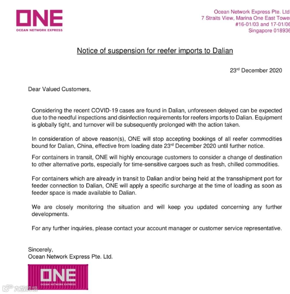 此前船公司ONE也发布通知:由于需要对进口到大连的冷藏集装箱进行检验和消毒,可能会出现不可预见的延误;而全球设备供应紧张,随着检验和消毒的程序执行,设备周转率将随之延长。鉴于上述原因,ONE将停止接收所有运至大连港的冷藏箱的预订,自2020年12月23日装船之日起生效,直至另行通知为止。