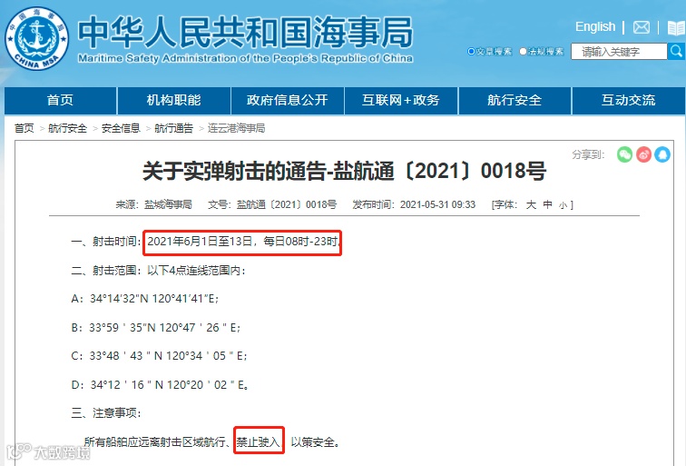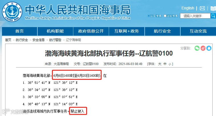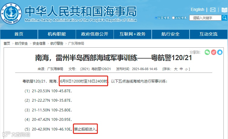 据广东海事局消息,粤航警120/21,南海,6月9日1200时至18日2400时,在