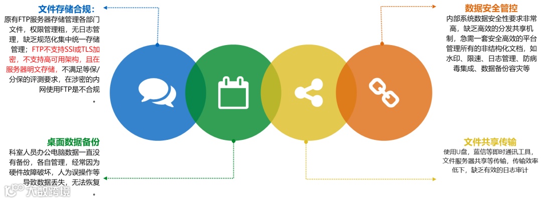 文件存储:原有FTP服务器存储管理各部门文件,权限管理粗,无日志管理,缺乏规范化集中统一存储管理;FTP不支持SSl或TLS加密,不支持高可用架构,且在服务器明文存储,不满足等保/分保的评测要求,在涉密的内网使用FTP是不合规;