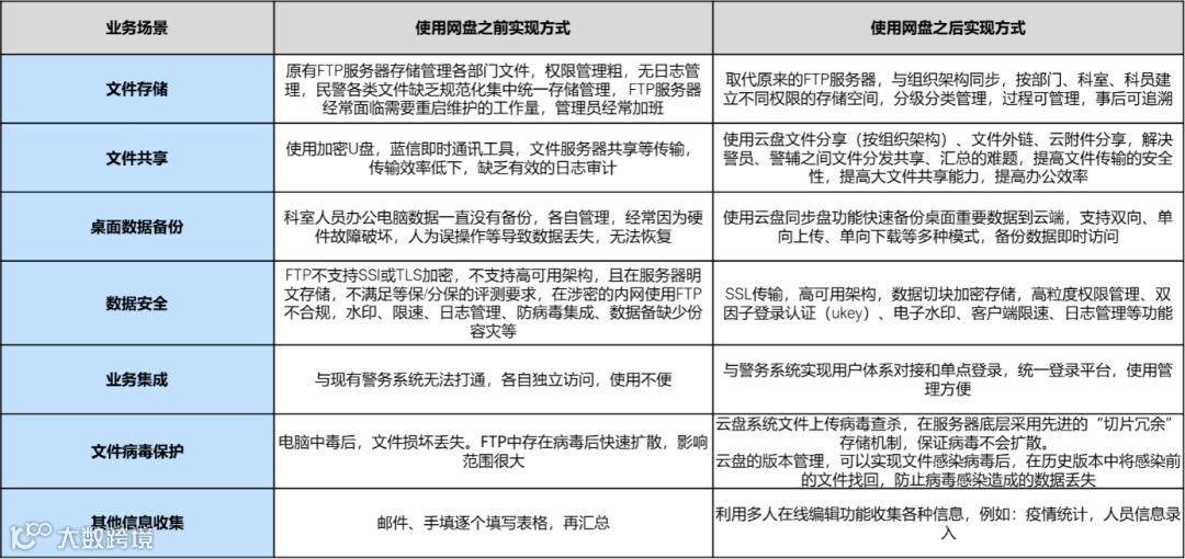业务常见问题:1、公安内办公文档数据处理量非常大,办公类数据非常多,需要实现在线编辑处理能力;2、民警、警辅之间大量的资料文件交互、流程繁琐分发汇总需求;3、现有文件管理无法实现与现有警务身份认证平台,警务云对接;4、案例证据的固化存储,警务数据细颗粒权限的管控需求。
