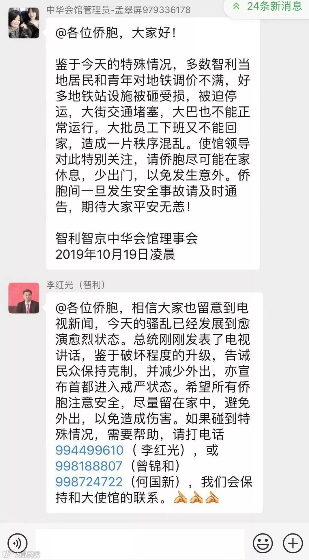 中国驻智使馆提醒在智中国公民保持警惕,加强安全防范和应急准备,避免夜间出行,确保人身安全,并公布系列紧急联系电话。通报称,如遇紧急情况,请立即报警并与使馆联系。