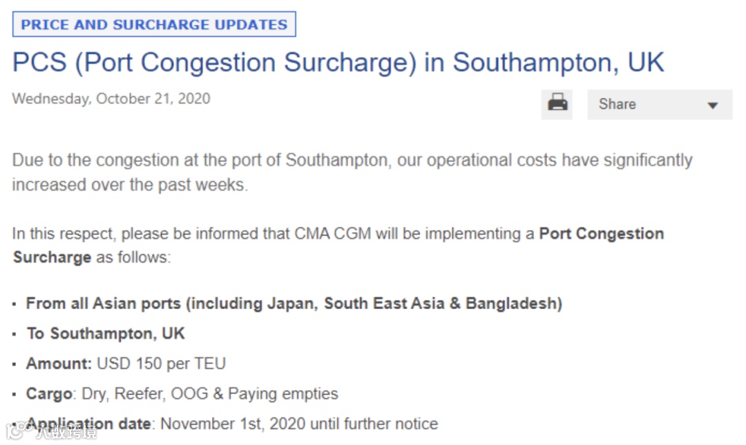 上周,达飞轮船宣布,由于南安普敦港的交通拥堵,运营成本在过去几周中大幅增加,将从11月1日起,所有从亚洲出口到南安普敦港的货物,征收150美元/TEU的港口拥堵附加费。