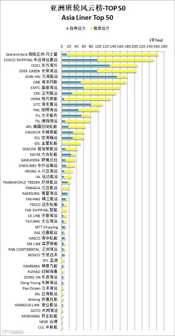 马士基重回“亚洲之王”第一名,旗下船队艘数达到101条,运力263679TEU;中远海运集运以运力251182TEU紧跟其后;东方海外第三名保持不变;长荣海运以204421TEU位列第四。