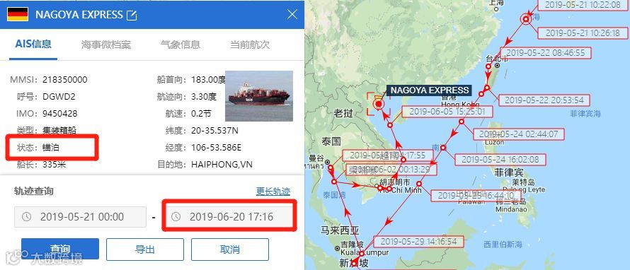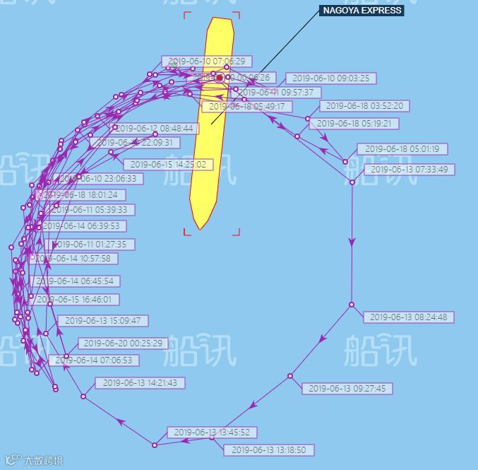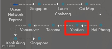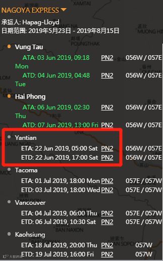 该轮服务的PN2航线经停港口:新加坡-林查班-盖梅-海防-盐田-塔科马-温哥华-高雄-新加坡。本该22日抵达盐田港,截止6月20日晚间该轮仍锚泊在海防港的外海域,目前来看船期已延误。