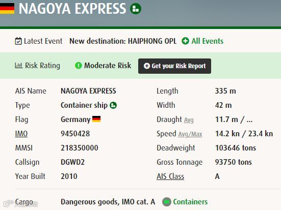 “NAGOYA EXPRESS”号集装箱船服务于THE联盟下的PN2航线,涉及Hapag-Lloyd、Ocean Network Express、OOCL、Yang Ming 4家承运人共舱。下一挂靠港为盐田港。