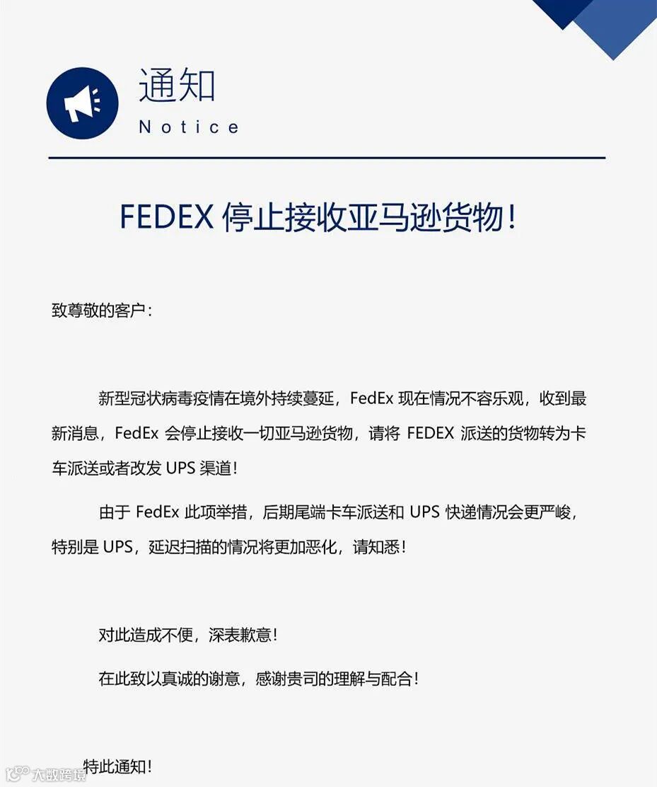 据透露,已有货代行业人士收到消息,受疫情影响,FedEx将暂停接收亚马逊货物,要求货代不能再接亚马逊卖家的货物。有货代已通知卖家,将FedEx派送的货物转为卡派或者改发UPS渠道。受此影响,后期尾程派送会更严峻,尤其是UPS,延迟扫描的情况可能更严重。