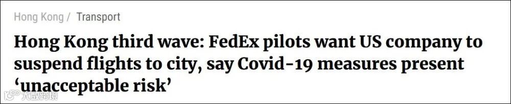 据香港《南华早报》29日报道,现在香港已经采取了更为严格的防疫措施,代表FedEx Express机组人员的协会声称香港现在所采取的新冠防疫措施会带来“不可接受的风险”,呼吁联邦快递暂停所有飞往香港的航班,来抗议香港政府对机组人员强制隔离的不接受。在他们发表声明之前,联邦快递的3名飞行员在香港被检测出感染新冠病毒并接受治疗。
