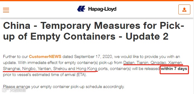 这是赫伯罗特继2020年8月19日和9月17日陆续发布的有关出口空箱提箱的客户通知后又一次更新。8月19日是船舶预计抵达前(ETA)8天内可以安排放箱。9月17日是船舶预计抵达前(ETA)10天内可以安排放箱(宁波:7天)。