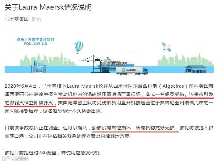 据了解,“LAURA MAERSK”号集装箱船服务于拉美/地中海的ECUMED航线,涉及多家船公司共舱:HAMBURG SÜD、MAERSK、SAFMARINE、SEAGO、SEALAND等。