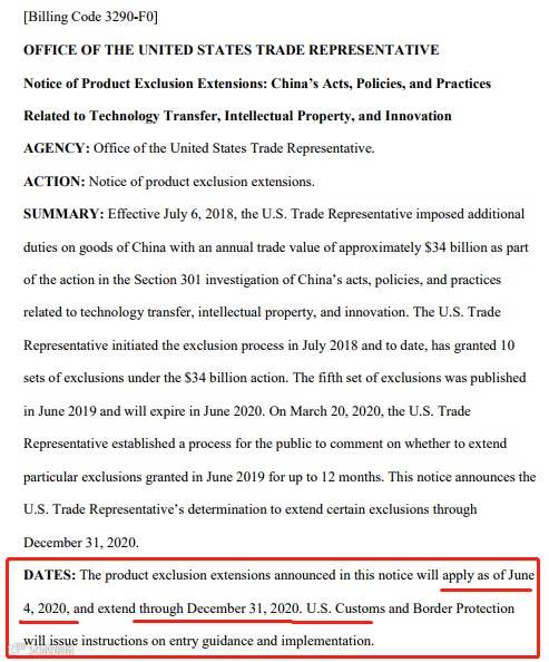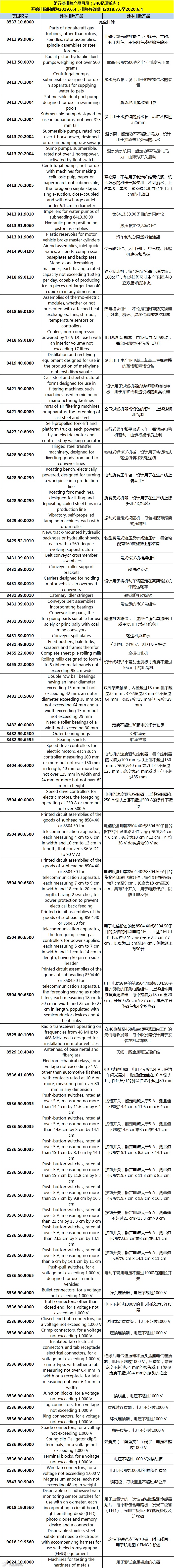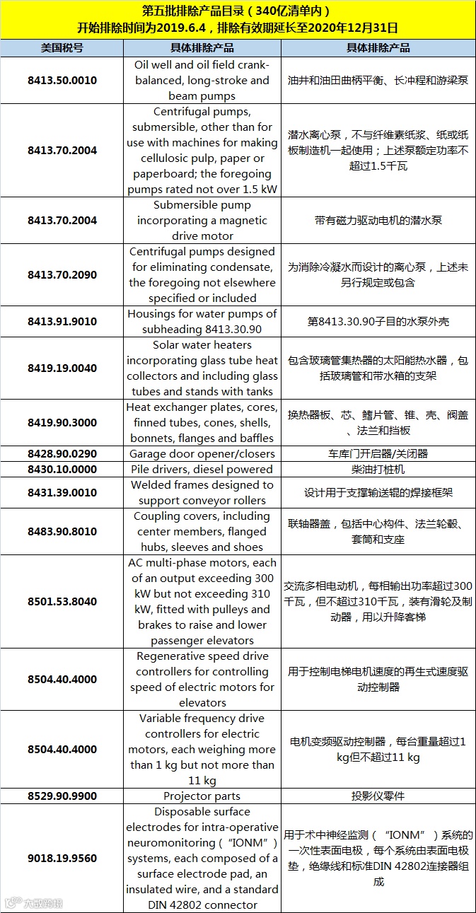 2019年6月4日针对340亿第五次排除清单共涉及43个税号89个品项的商品。此次未获得延长有效期的包括1个税号“8537.10.8000”下所有商品和34个税号下72个品项的商品,将于2020年6月4日到期后,被移出排除清单。即2018年7月6日至2020年6月4日期间,这些商品可免加征关税,但从2020年6月4日起,恢复额外加征关税25%。
