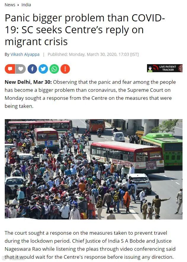 解析:印度最高人民法院周一观察到,人们的恐慌和恐惧已成为比冠状病毒更大的问题,最高法院要求抗疫中心就正在采取的措施作出回应。