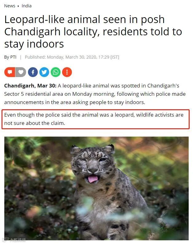 解析:星期一早上,昌迪加尔居民区发现了一只豹子般的动物,此后警方在该地区发布公告,要求人们呆在室内。