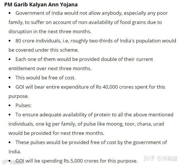 6、印度不允许任何人任何家庭断粮,给8亿人即2/3的人口,免费提供2倍于当前标准的粮食供应,预计花费4000亿卢比,同时为保证每个人蛋白质获取量,每个家庭接下来三个月为每个家庭提供1公斤豆类,预计花费500亿卢比;
