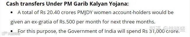 3、“PMJDY普惠金融计划”在未来三个月为2亿女性账户每月提供500卢比特惠(价值人民币50元),总计花费3100亿卢比;