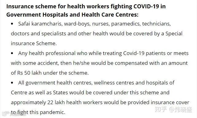 1、针对医务工作者的保险,任何治疗COVID-19病人遇到意外的医务工作者将获得500万卢比赔偿(价值人民币50万左右补偿)大致惠及220万医务工作者;