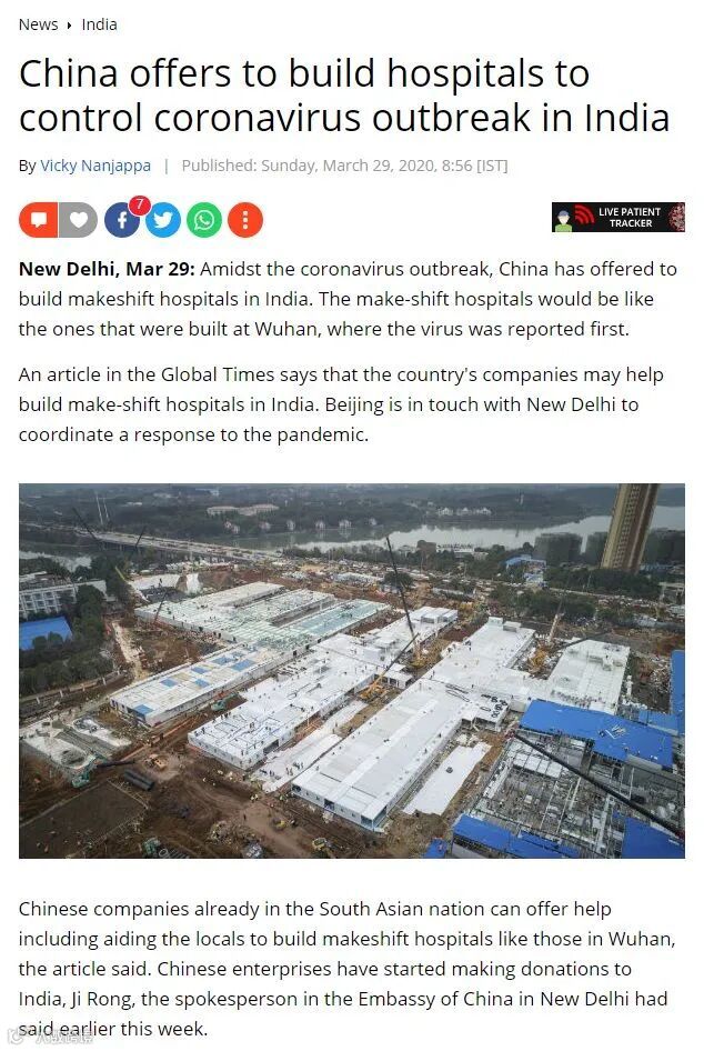 新德里3月29日消息,在冠状病毒爆发期间,中国提出在印度建立临时医院。临时医院就像在武汉建立的医院一样,医院首先报告了该病毒。