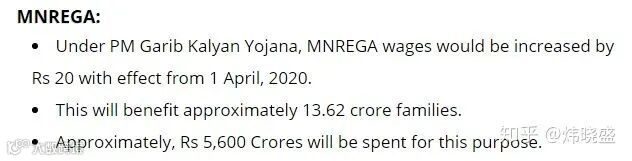 7、农业就业计划(MNREGA)涉及的1.36亿家庭将受益从2020年4月1日起工资增加20卢比(价值人民币2元),总计花费560亿卢比;