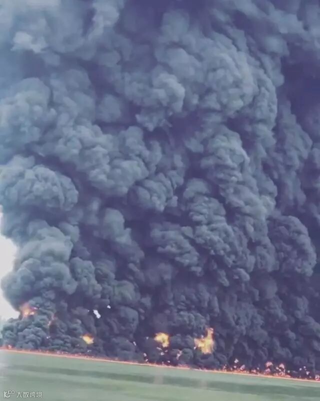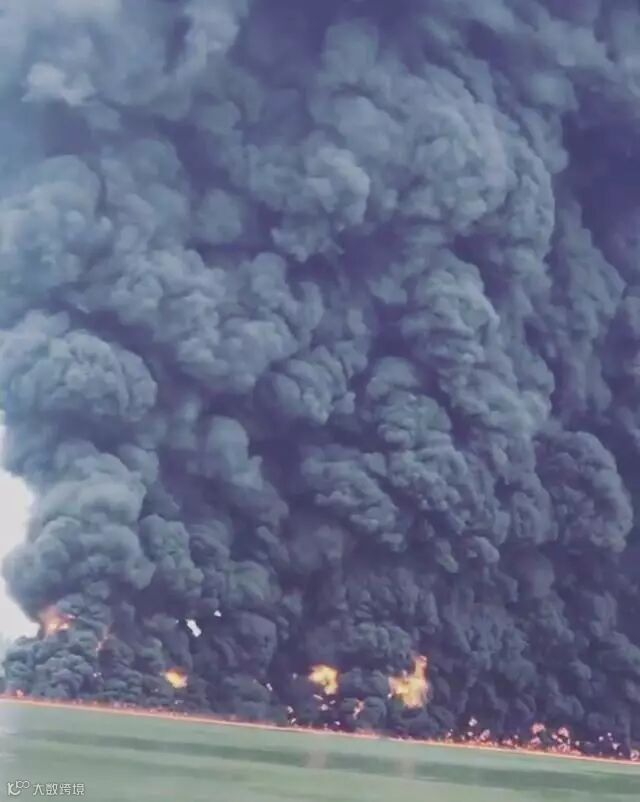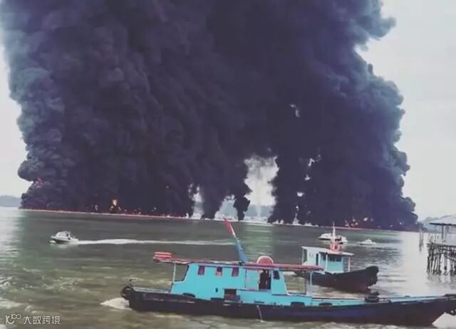 漏油在水面上燃烧导致浓烟滚滚