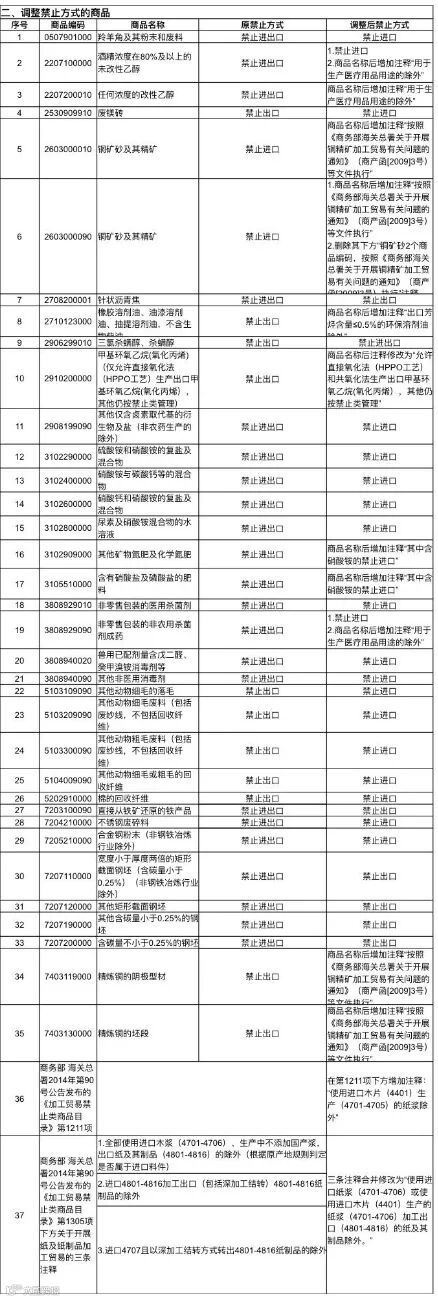 (二)禁止出口调整为禁止进口。
