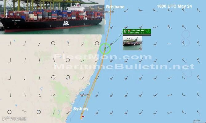 APL 英格兰号是一艘悬挂新加坡国旗的集装箱船,IMO 9218650,载重吨67987,5510 TEU,建造于2001年,该船从上海出发前往墨尔本港,周日上午6点后不久,由于动力不足,在APL ENGLAND集装箱船离开港口后该船产生剧烈摇晃,多个集装箱倒塌并落到船外。