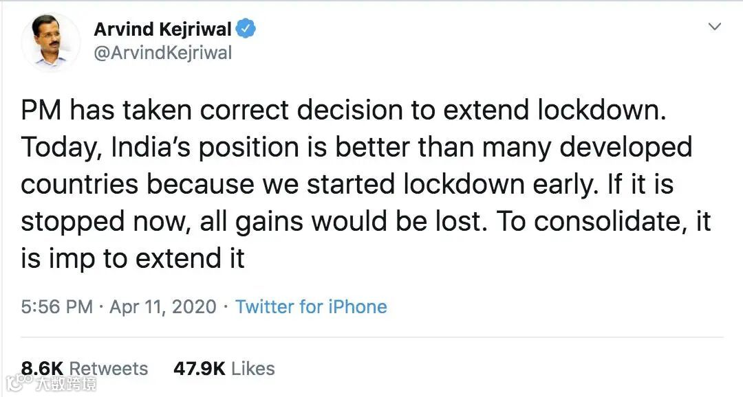 德里首席部长Arvind Kejriwal在社交媒体上发文称,“总理做出了延长封锁的正确决定。今天,印度做的比许多发达国家都要好,因为我们很早就开始封锁了。如果现在停止,一切的努力将前功尽弃。”