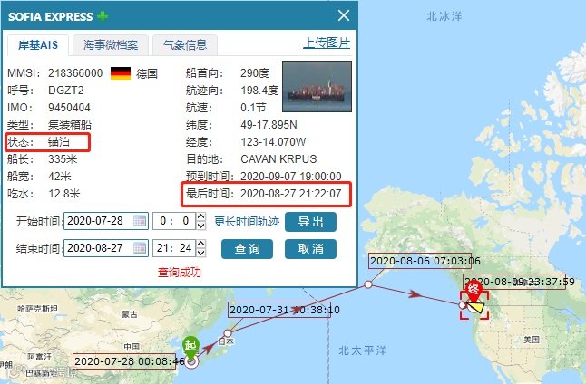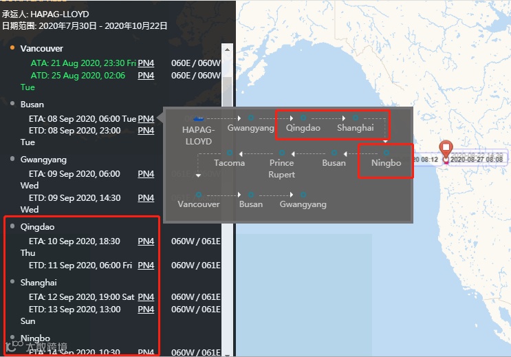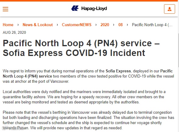 据悉,集装箱船“SOFIA EXPRESS”号是赫伯罗部署在服务于Pacific North Loop 4 (PN4)航线的船舶。根据大船期数据显示,“SOFIA EXPRESS”轮曾挂靠青岛港、上海港、宁波港。8月21日,该轮驶抵温哥华港,目前仍处于隔离状态。“SOFIA EXPRESS”号共涉及4家船公司共舱:HAPAG-LLOYD、HMM、ONE、YANG MING。
