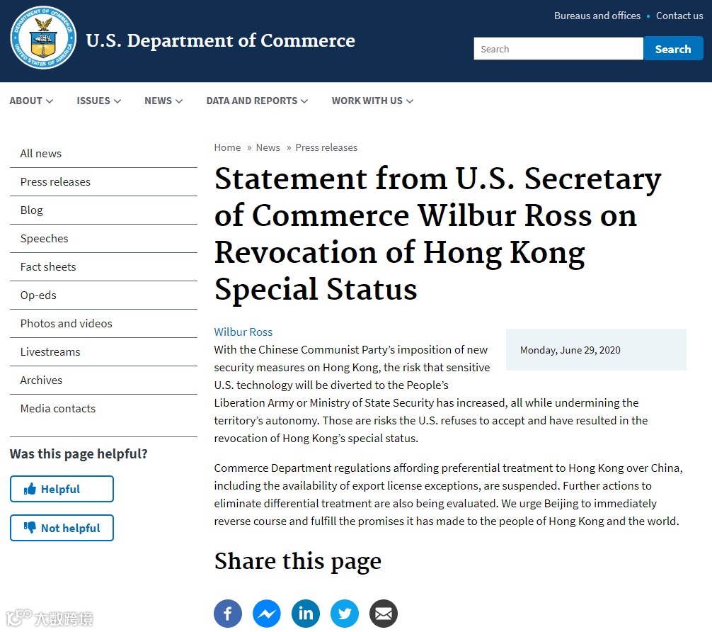 当地时间6月29日,美国商务部长威尔伯·罗斯发表声明,宣布美国商务部取消了香港的特殊地位待遇,暂停为香港提供优于中国内地的优惠待遇,包括出口许可证豁免。