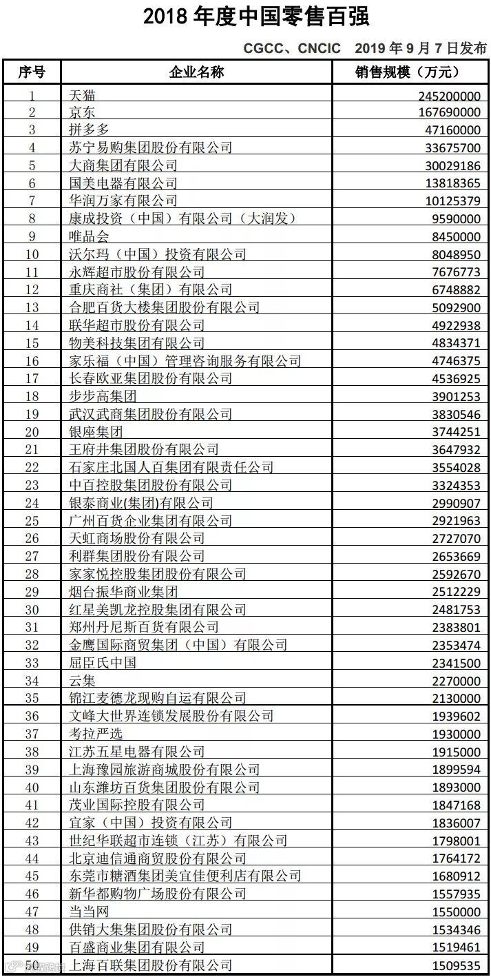 2018年度中国零售百强名单近日发布。百强总销售规模首超7万亿元,天猫和京东领跑零售业百强。