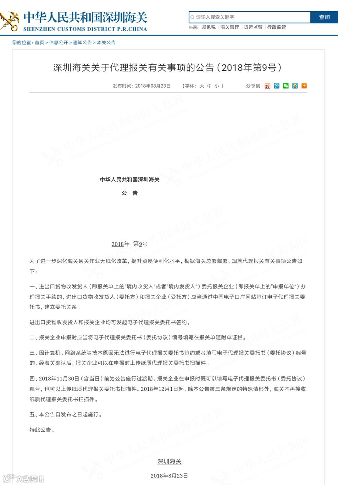 深圳海关关于代理报关有关事项的公告(2018年第9号)