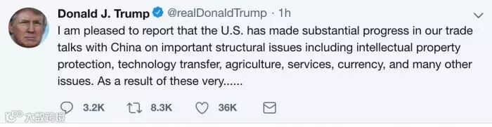 “今天,我非常开心地宣布,中美贸易谈判在一些重要的结构性议题中获得进展,包括知识产权保护、技术转让、农业、服务,货币以及很多其他议题。”