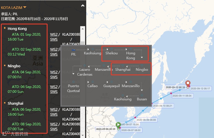 “KOTA LAZIM”轮于2020-08-31挂靠蛇口、2020-09-01挂靠中国香港、2020-09-04挂靠宁波、2020-09-07挂靠上海洋山港。